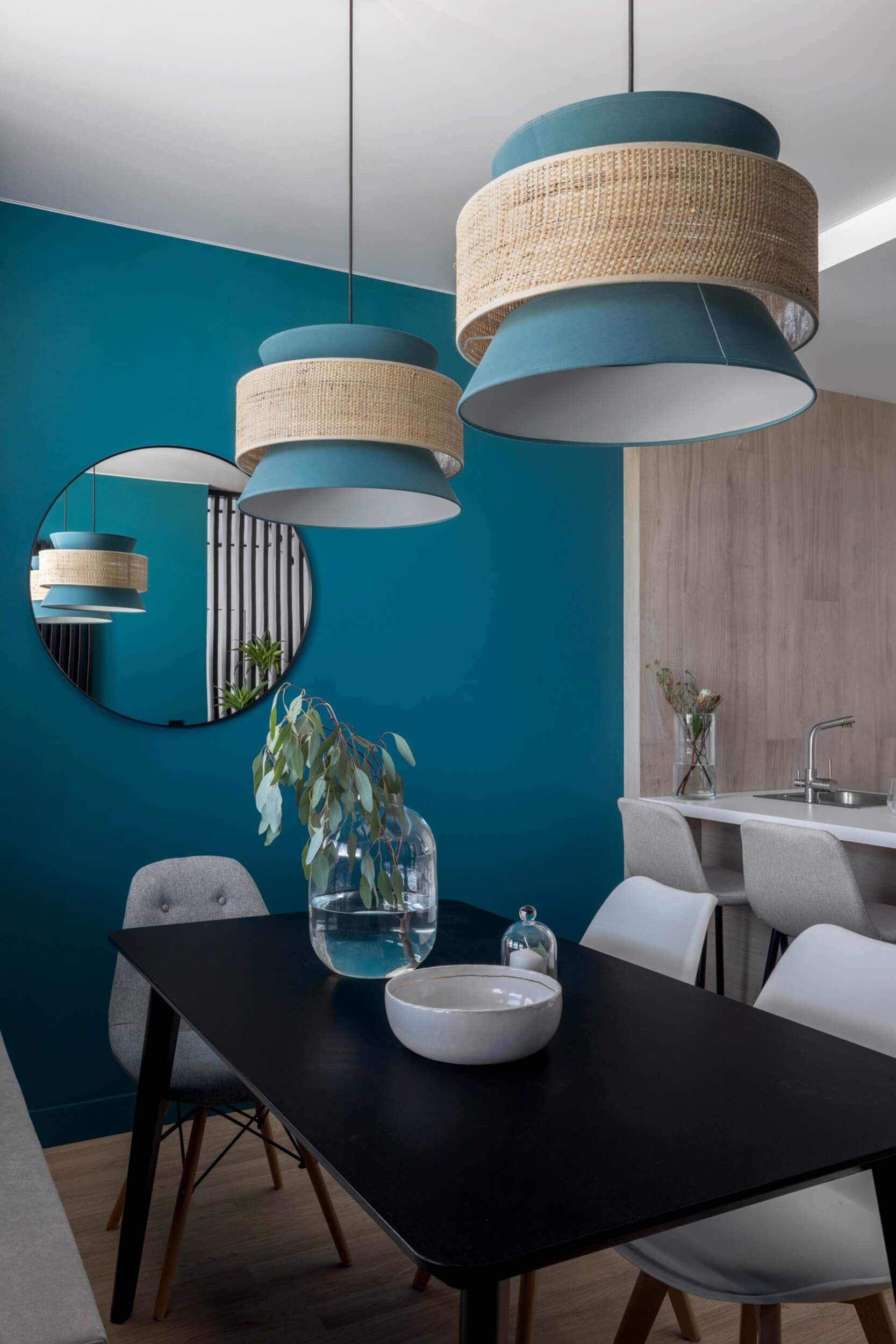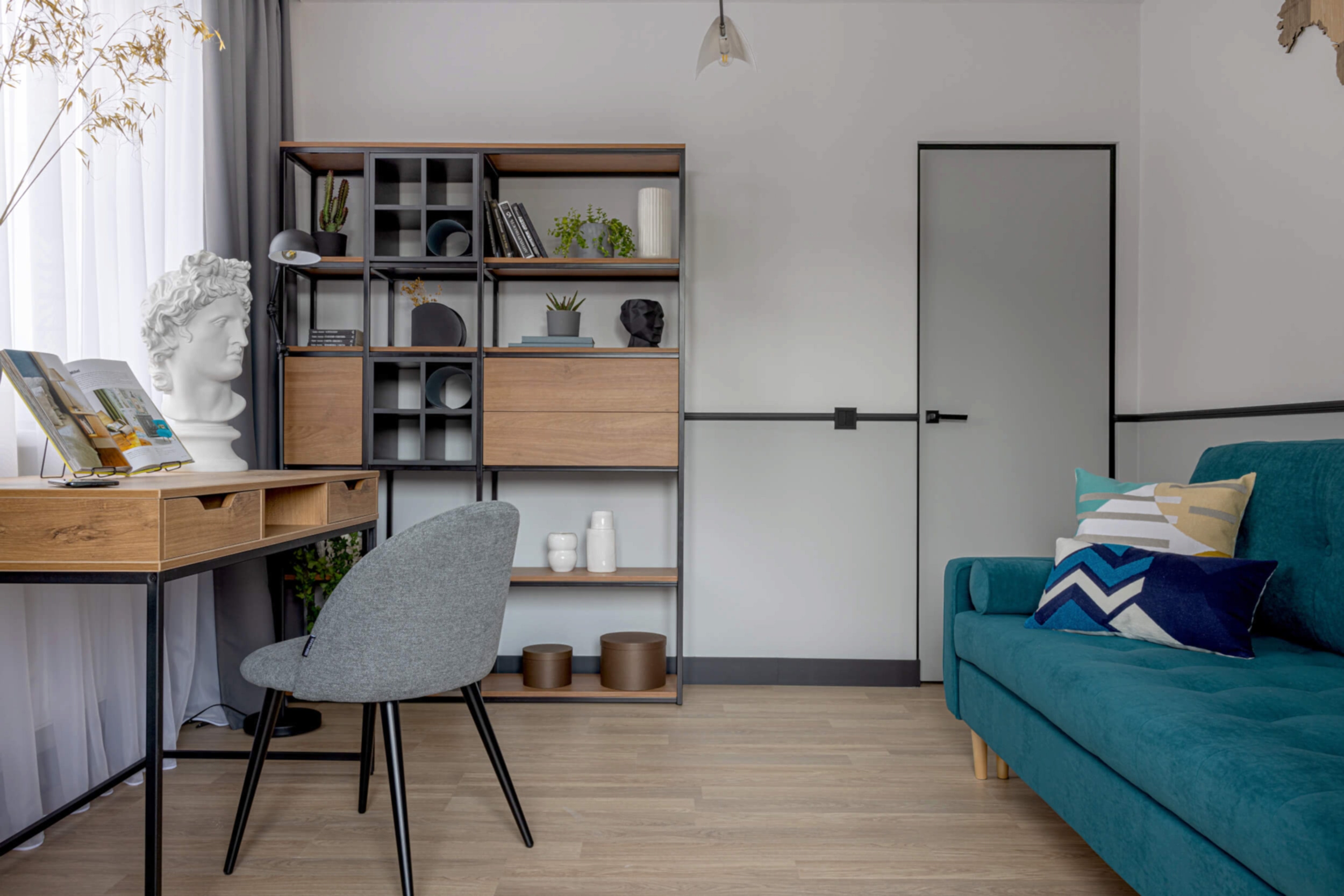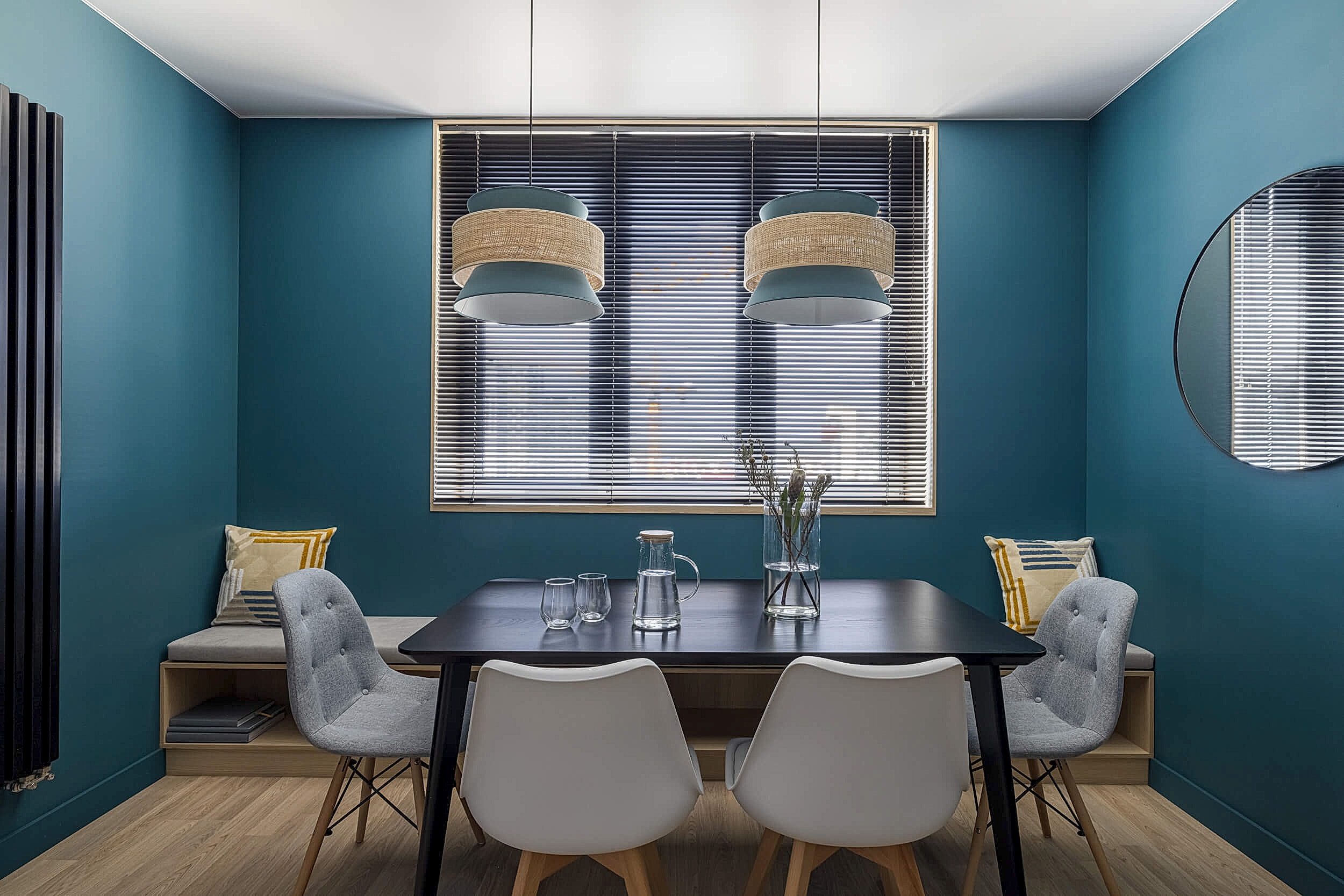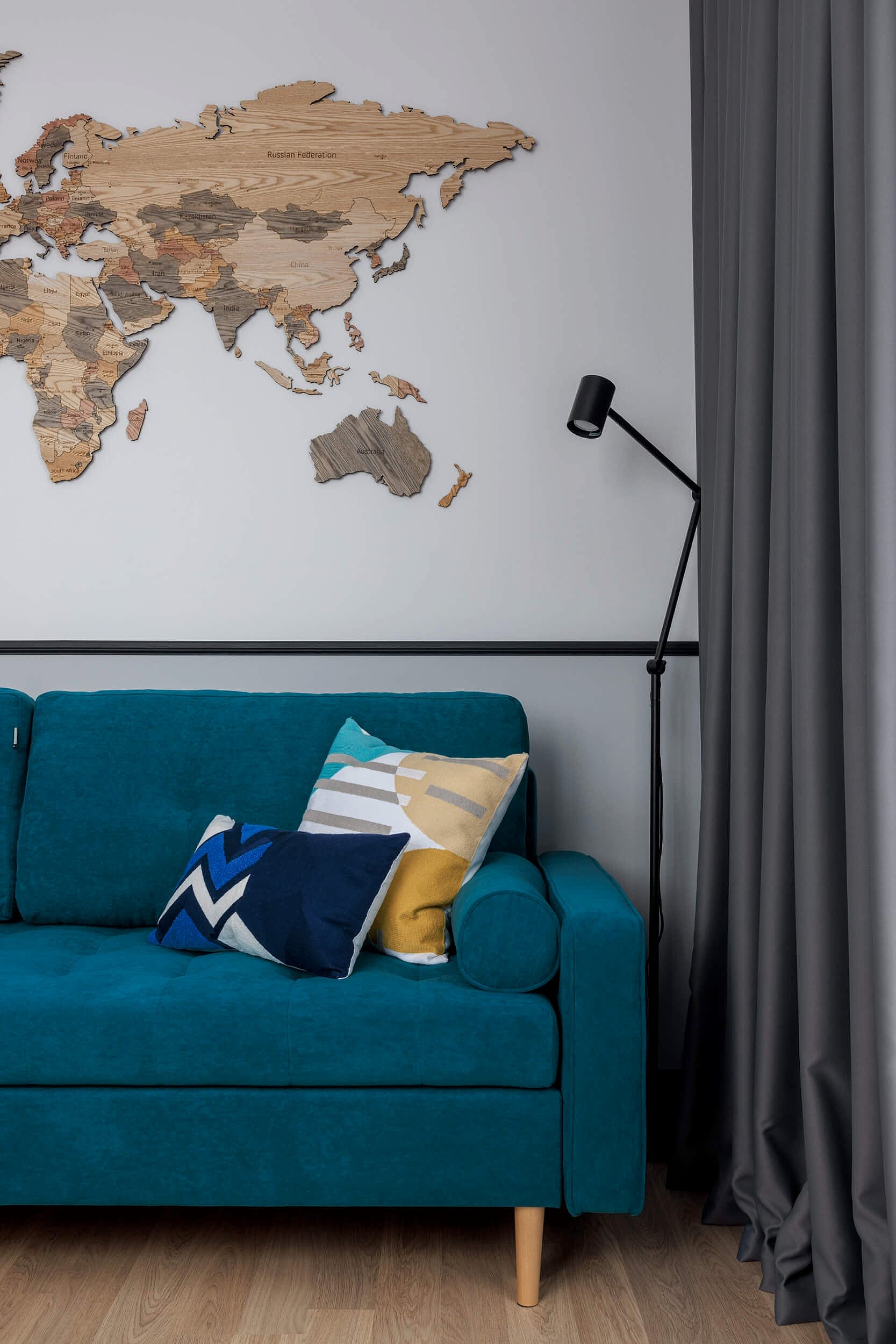 Уютная и Pin-Up квартира для женщины 80 м2в ЖК Nova Park. Стиль интерьера: современный со скандинавскими ноткам. Преобладающий цвет сине-зеленый, который проходит через всю квартиру. Квартира двухкомнатная с общим пространством кухня-гостиная.