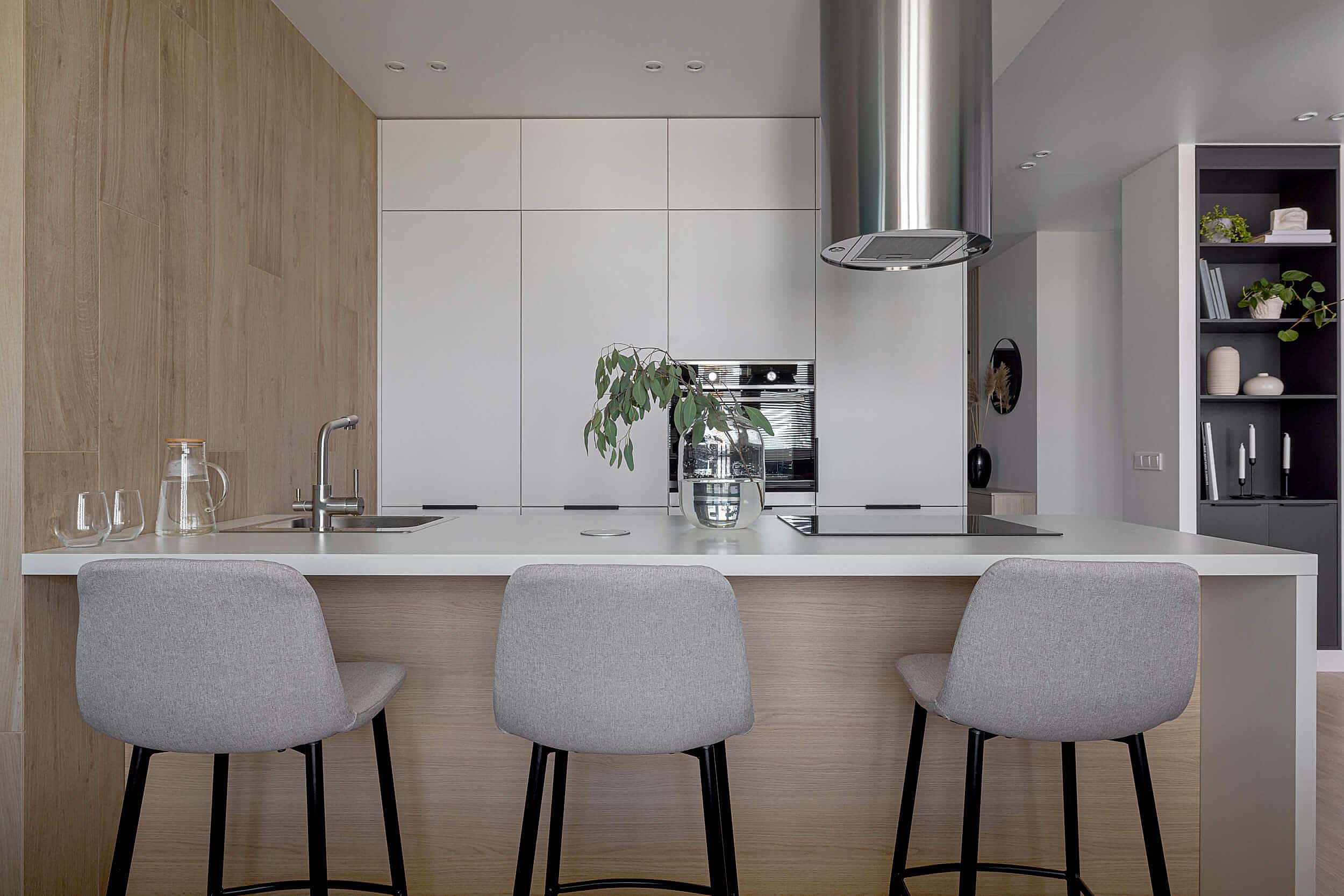 Если вы хотите съэкономить, то это можно сделать на свете, как в этом проекте: все освещение выполнено на точечных светильниках, есть небольшая шинная система и несколько подвесов в зоне обеденного стола и в кабинете.