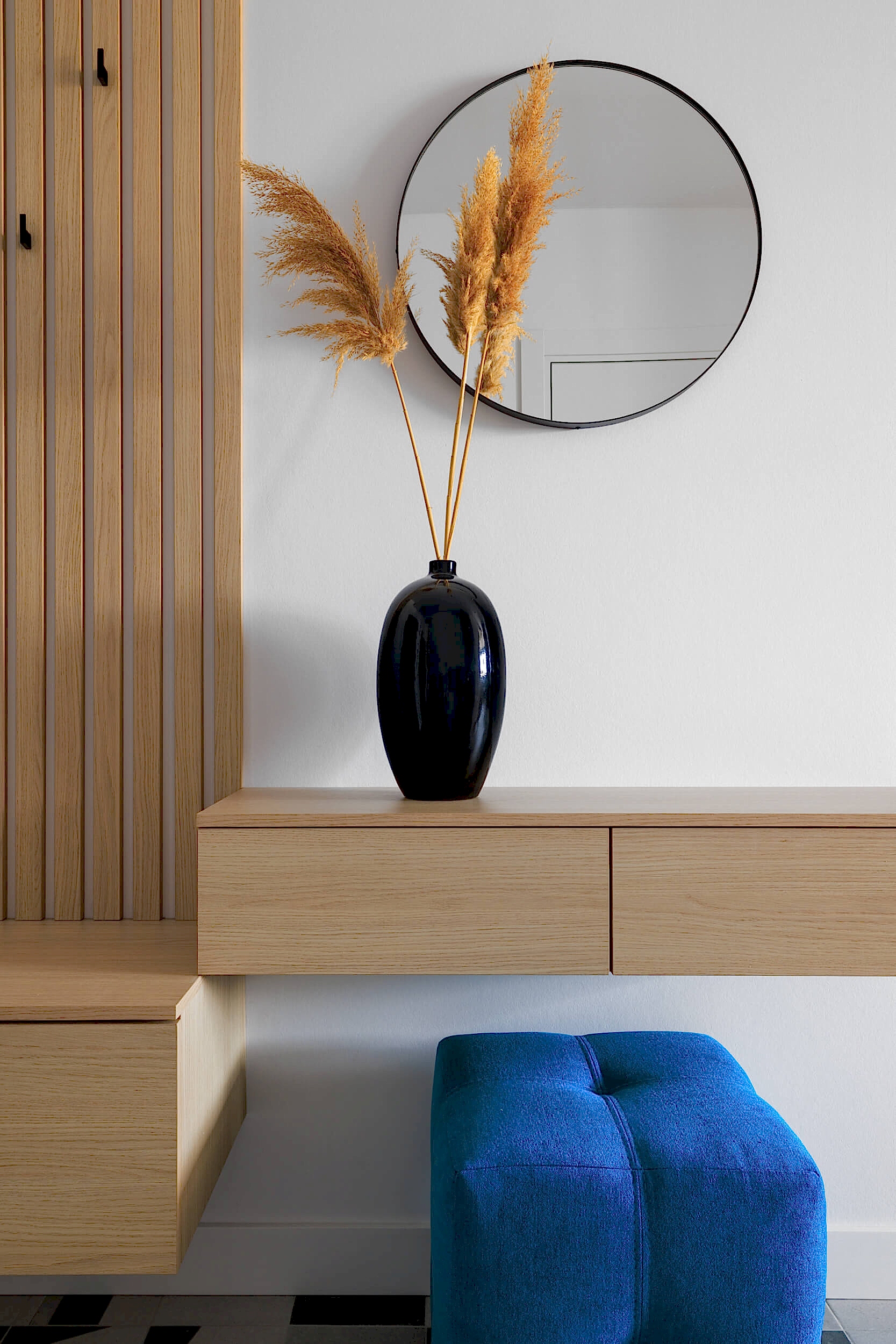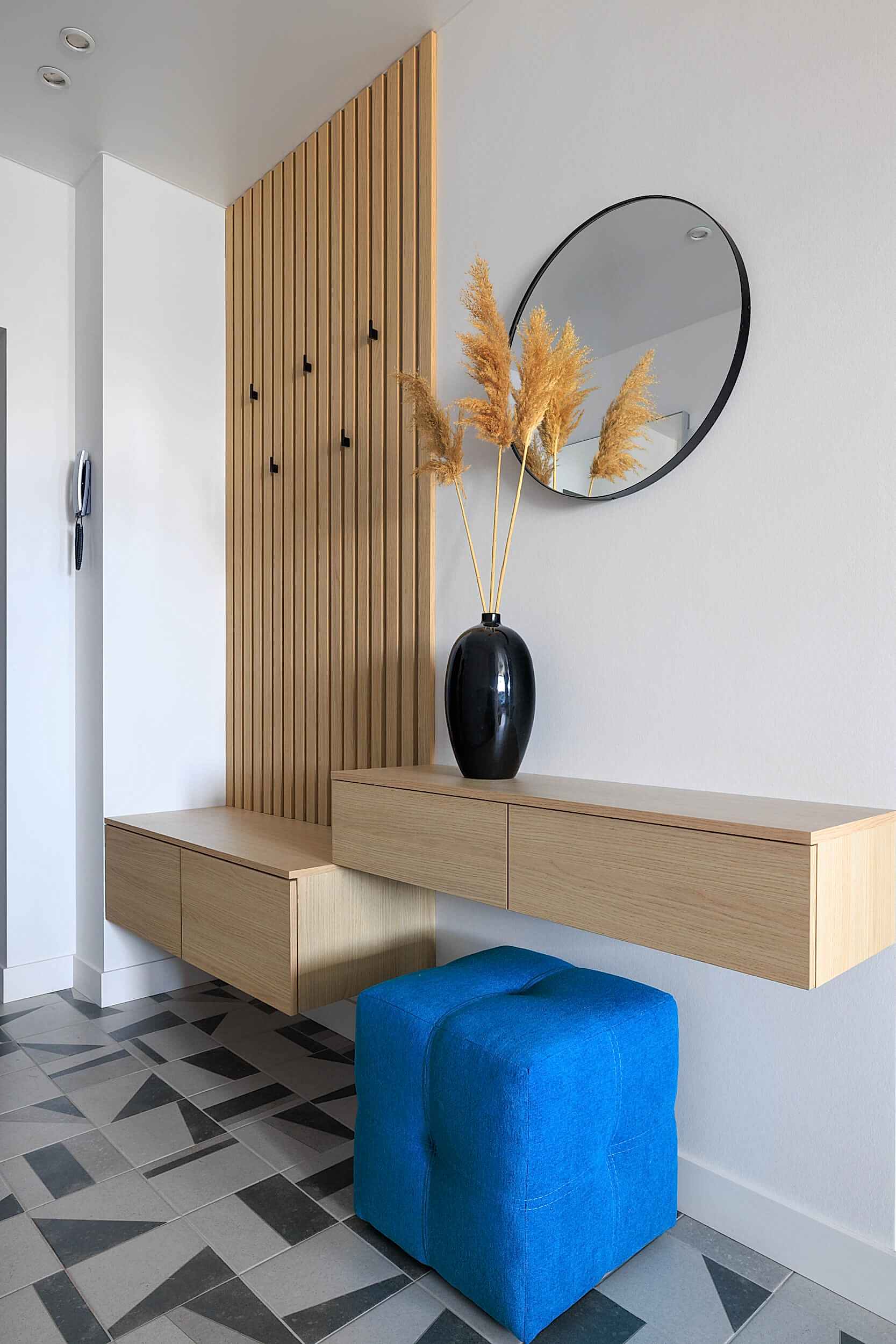 В прихожей мы отказались от Pin-Up шкафа для того, чтобы было больше пространства, света и воздуха. Сделали легкую прихожую, за зеркальной откатной дверью прячется гардероб. На полу акцентная плитка компании Vives ceramika.