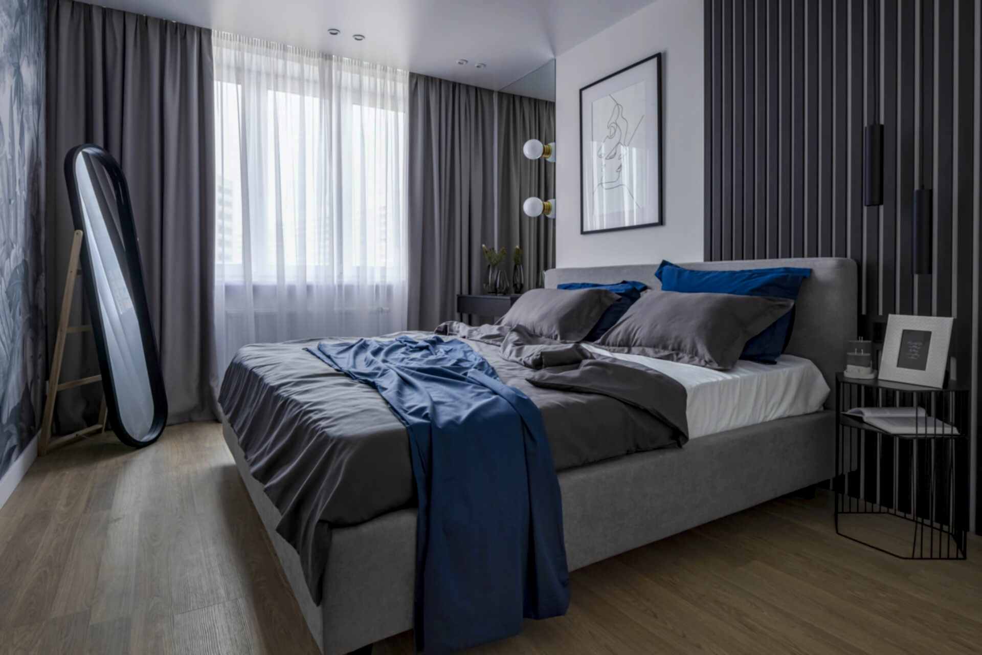 Большая кровать с подъемным механизмом и системой хранения. На стене за изголовьем кровати мы повторили элемент с рейками из Pin-Up