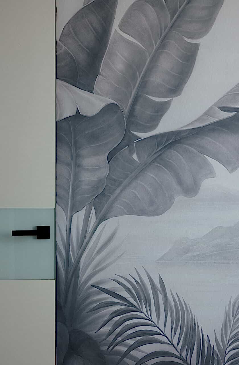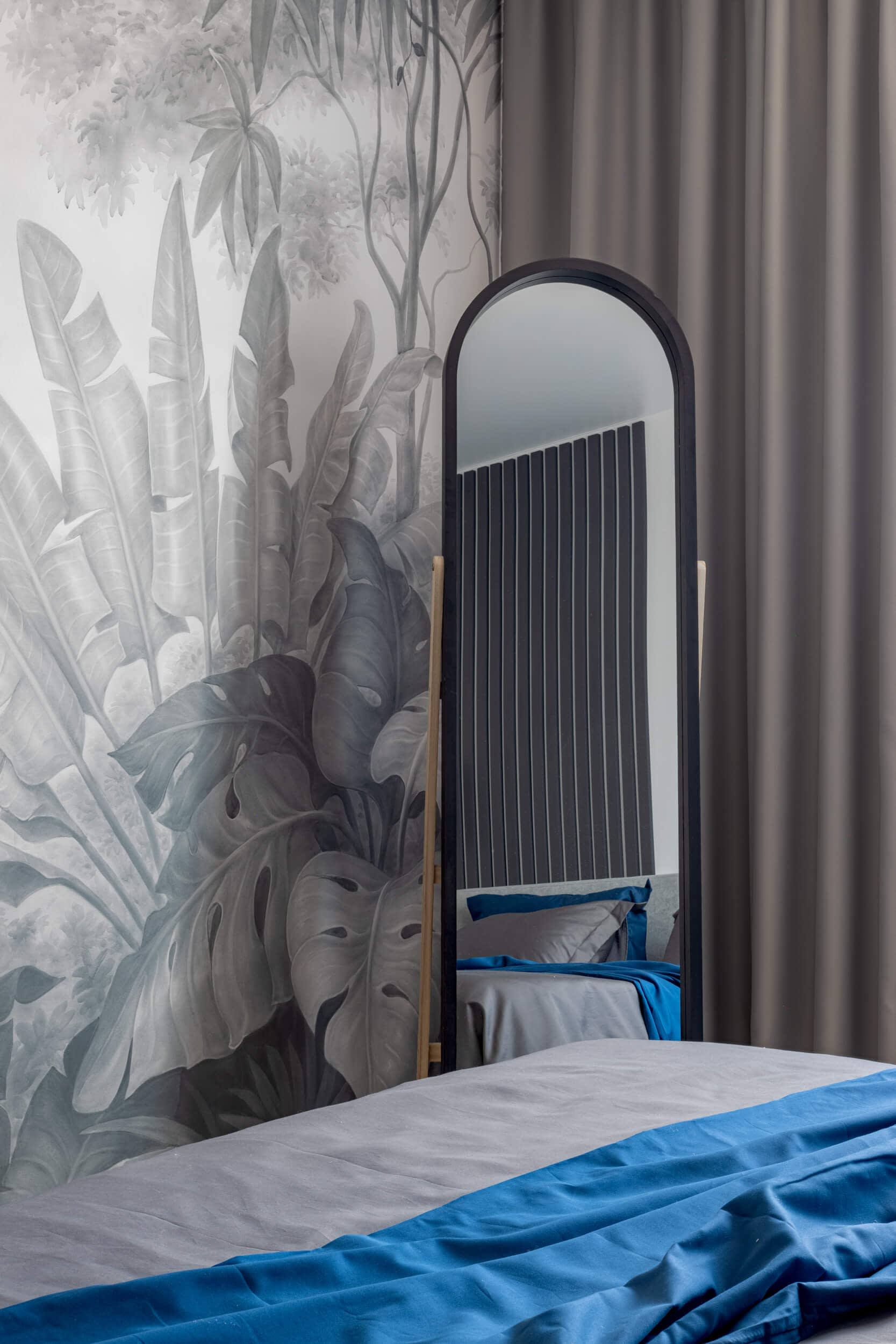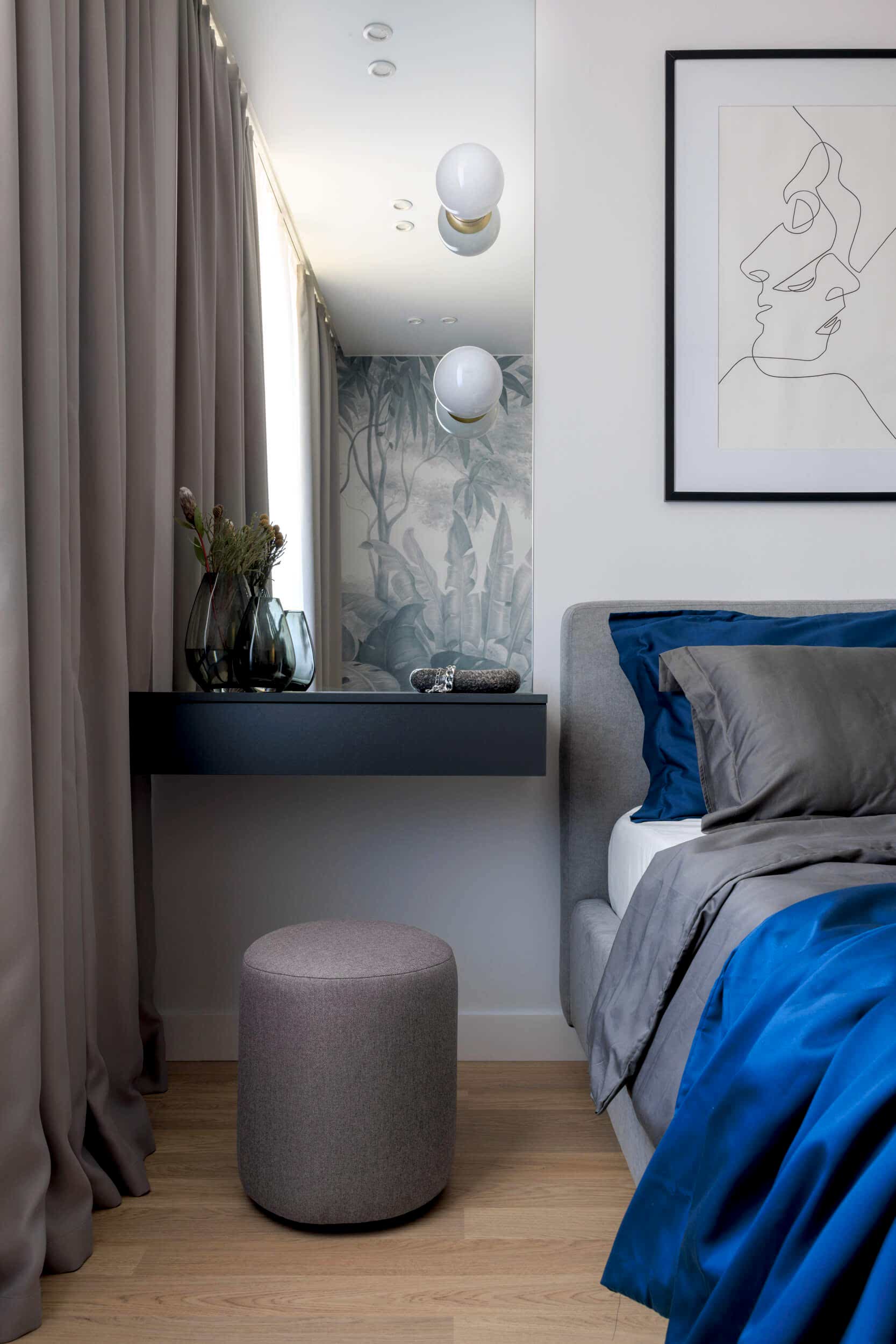 Спальня выполнена в спокойных серых тонах. В спальне все, что должно быть: кровать, тумба, шкаф и трюмо. Зону напротив кровати обыграли монохромными фотообоями с Pin-Up темой.