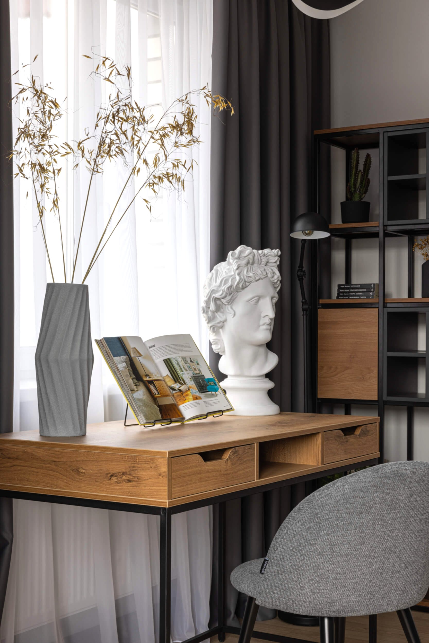 Больше всего времени хозяйка будет проводить в кухне-гостиной, она включает в себя 4 Pin-Up обеденная зона столовая, зона ТВ с диваном и телевизором и зона отдыха с библиотекой и биокамином. Чтобы лучше зонировать пространство, мы сделали легкую перегородку между диваном и столовой, украсили ее живыми цветами.