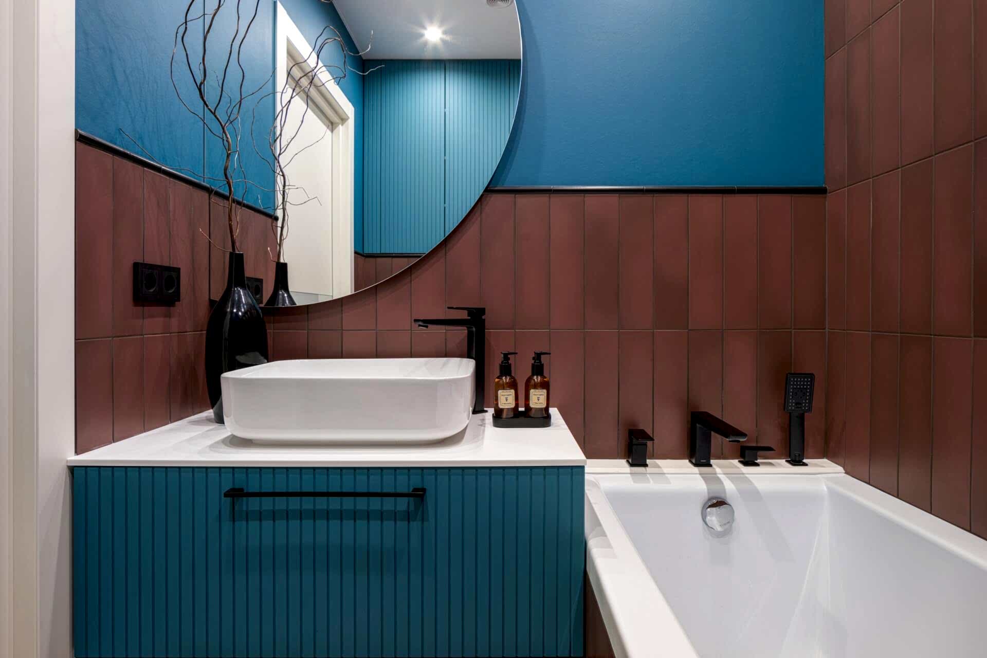 Ванная комната яркая, сочная и насыщенная в отделке использована Pin-Up плитка, а часть стен мы окрасили.